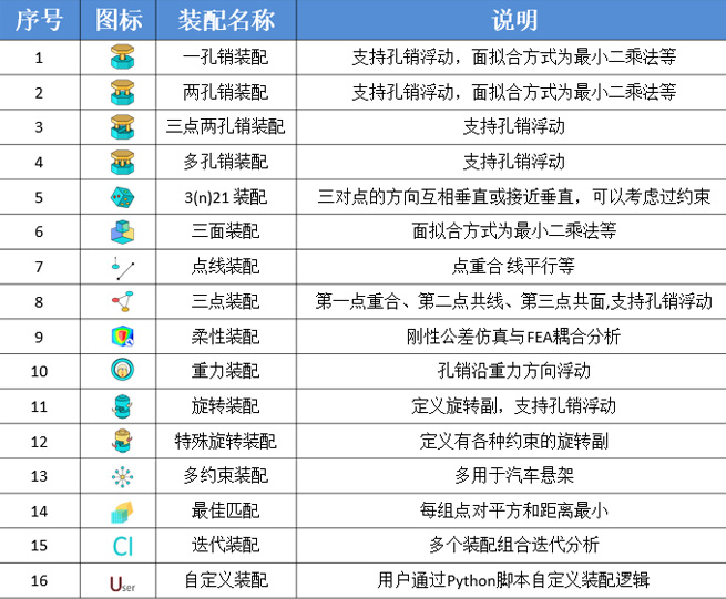 ·支持各种工业场景的装配形式定义,包括:单孔单销装配、孔孔装配、两孔销装配、三点两孔两销装配、多孔销装配、321装配、面面装配、柔性装配、重力装配、点点装配、点线装配、三点装配、Bestfit装配、多约束装配、旋转装配、特殊旋转装配,光学装配等支持复杂、多层级嵌套的产品公差仿真分析
